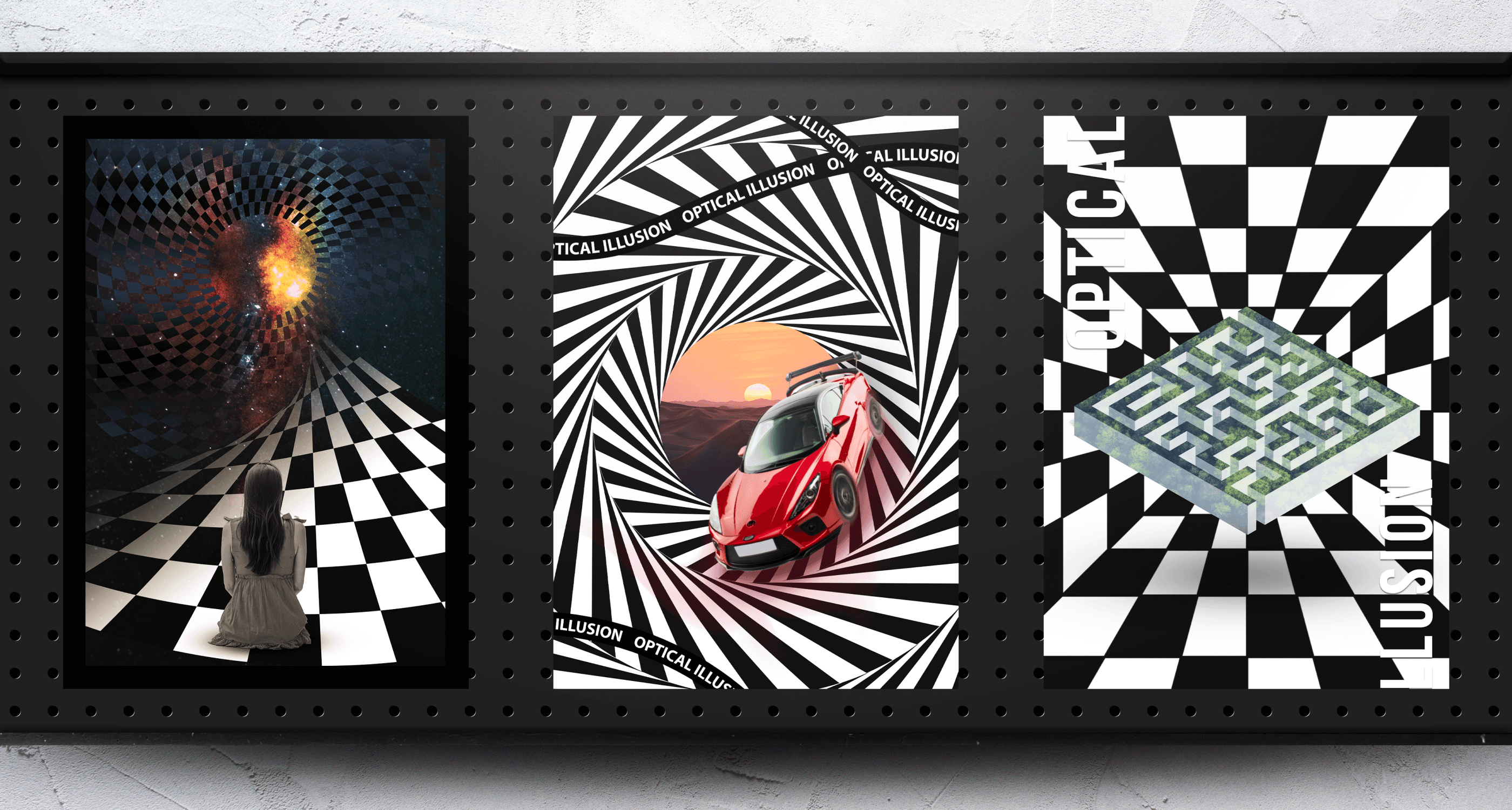 I have applied optical illusion elements to create designs, using distortion, layering, and contrast. Each piece invites the viewer to experience unexpected visual effects in a new context.